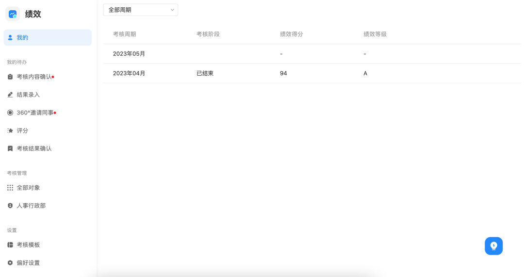 评分流程结束后,会根据综合评分得出最终的绩效得分和绩效等级,可以在「我的绩效」中查看自己的绩效得分以及绩效等级