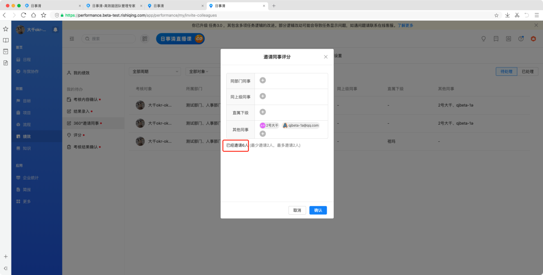 点击右上角邀请同事评分,添加需要邀请的同事,点击确认即可。