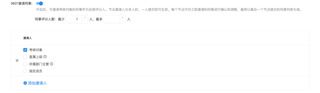 首先,它可以同时对多个员工进行考评,你可以为被考核人一键添加上级、下级、同事、自己等考评人,考评人一般为与被考评者工作联系较为密切的人,他们对被考评者的工作技能、工作态度及工作绩效较为熟悉。