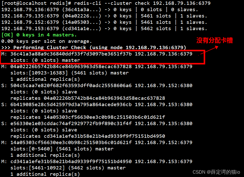 检查当前集群节点信息如下图:发现新加入的节点没有分配卡槽。