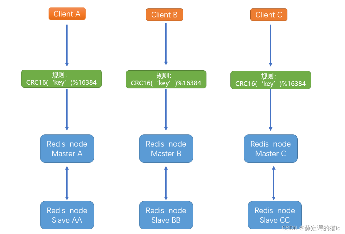 - Redis cluster预先分配16384个(slot)槽位,当需要在redis集群中写入一个key -value的时候,会使用CRC16(key) mod 16384之后的值,决定将key写入值哪一个槽位从而决定写入哪一个Redis节点上,从而有效解决单机瓶颈。
