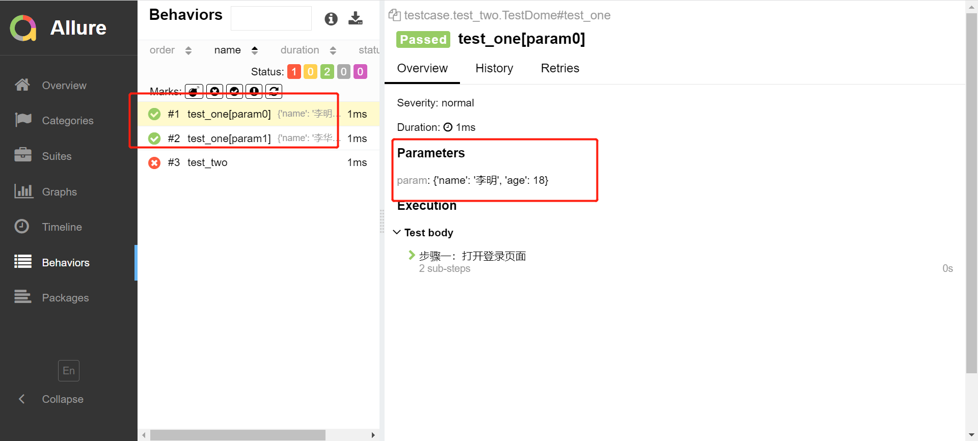 | 123456789101112131415 | import pytest``import allure class TestDome:``@pytest``.mark.parametrize(``"param"``, [{``"name"``: "李明"``, "age"``: 18``}, {``"name"``: "李华"``, "age"``: 17``}])``def test_one(``self``,param):``with allure.step(``"步骤一:打开登录页面"``):``with allure.step(``"步骤二:输入正确的用户名和密码"``):``with allure.step(``"步骤三:点击登录"``):``assert True def test_two(``self``):``print``(``"我是test_two"``)``assert False |