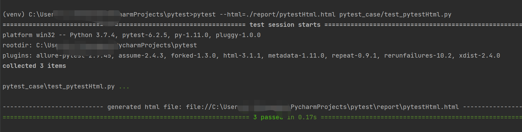 2.在Terminal运行命令:pytest --html=生成报告的url 运行用例的.py文件,运行成功后,这个时候我们去