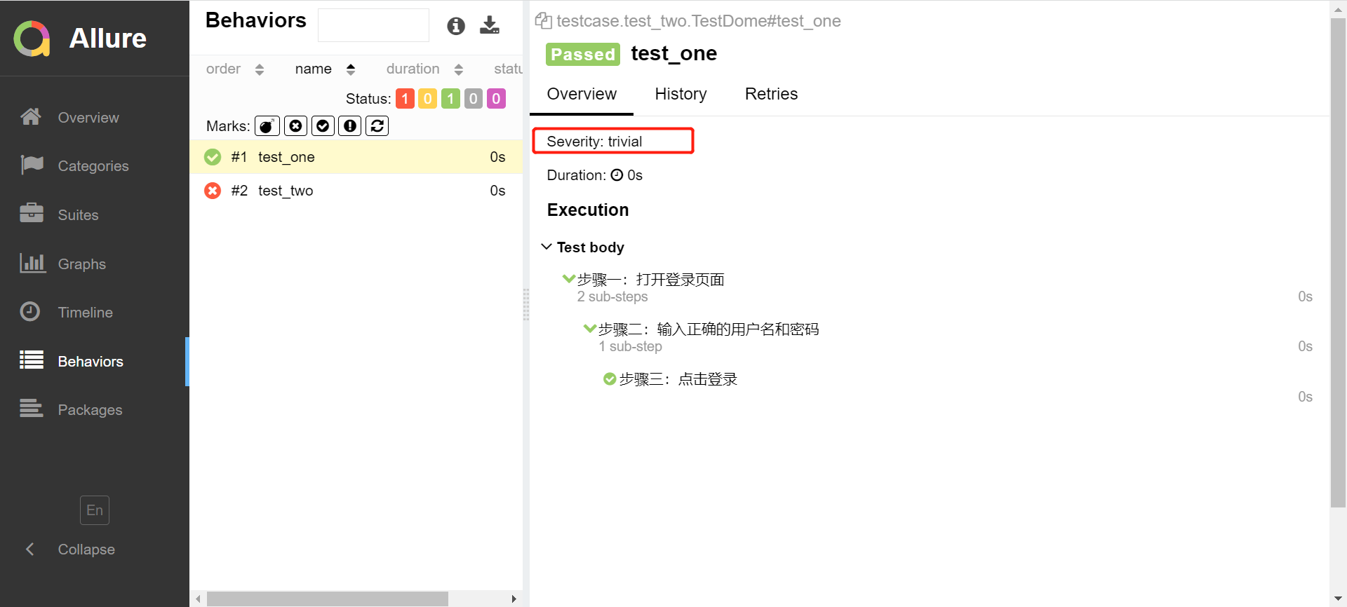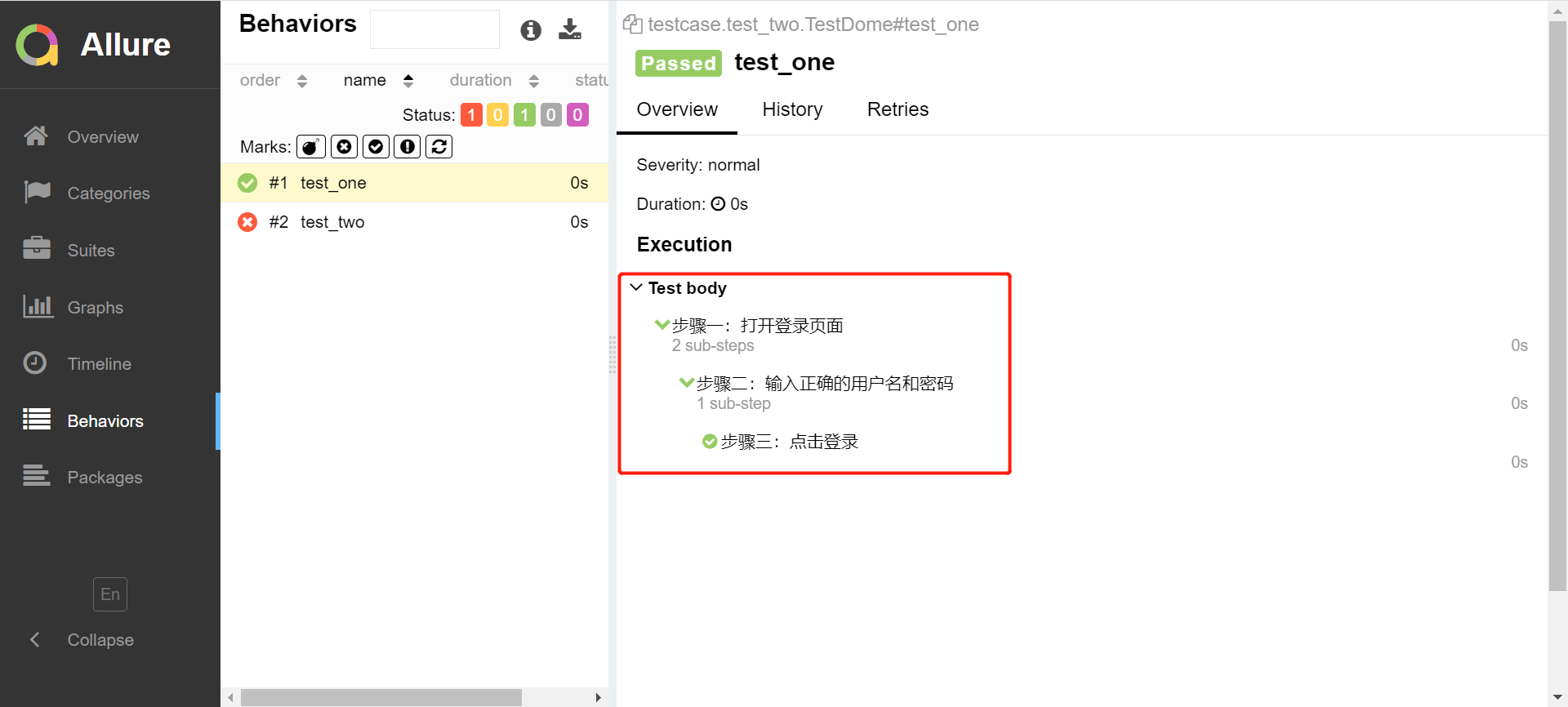 | 123456789101112131415 | import pytest``import allure class TestDome: def test_one(``self``):``with allure.step(``"步骤一:打开登录页面"``):``with allure.step(``"步骤二:输入正确的用户名和密码"``):``with allure.step(``"步骤三:点击登录"``):``assert True def test_two(``self``):``print``(``"我是test_two"``)``assert False |