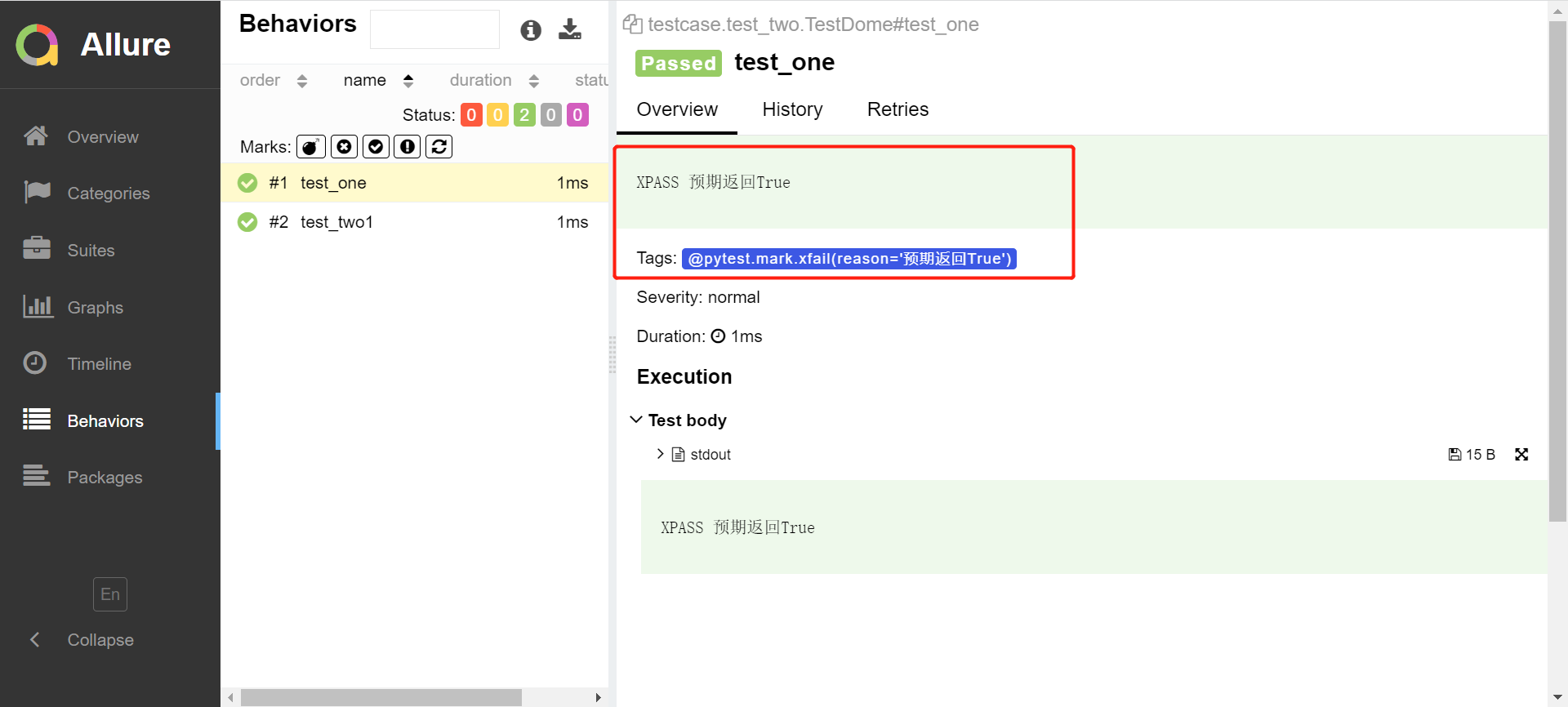 | 12345678910111213 | import pytest``import allure class TestDome:``@pytest``.mark.xfail(reason``=``"预期返回True"``)``def test_one(``self``):``print``(``"我是test_one"``)``assert True def test_two1(``self``):``print``(``"我是test_two"``)``assert True |