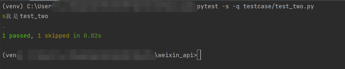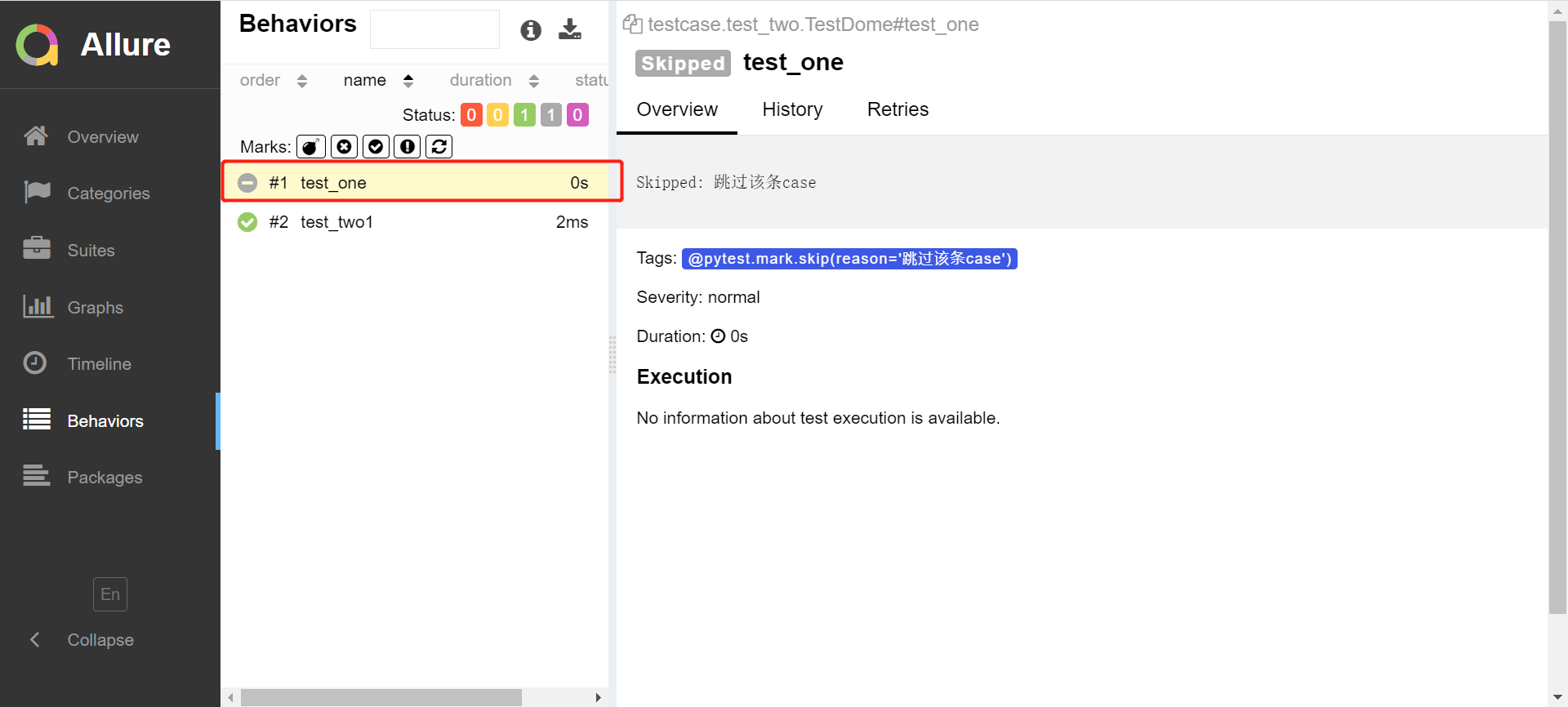 这里可以看出test_one case跳过后并没有运行,置灰显示