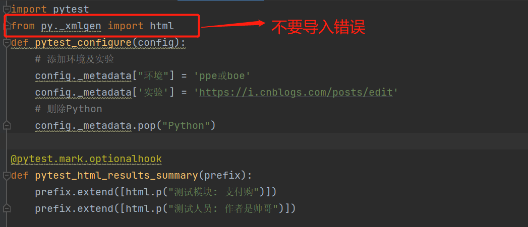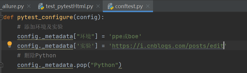 己想要的环境,可在根目录下创建conftest.py文件,如下图,pytest_configure(config): 许插件和conftest文