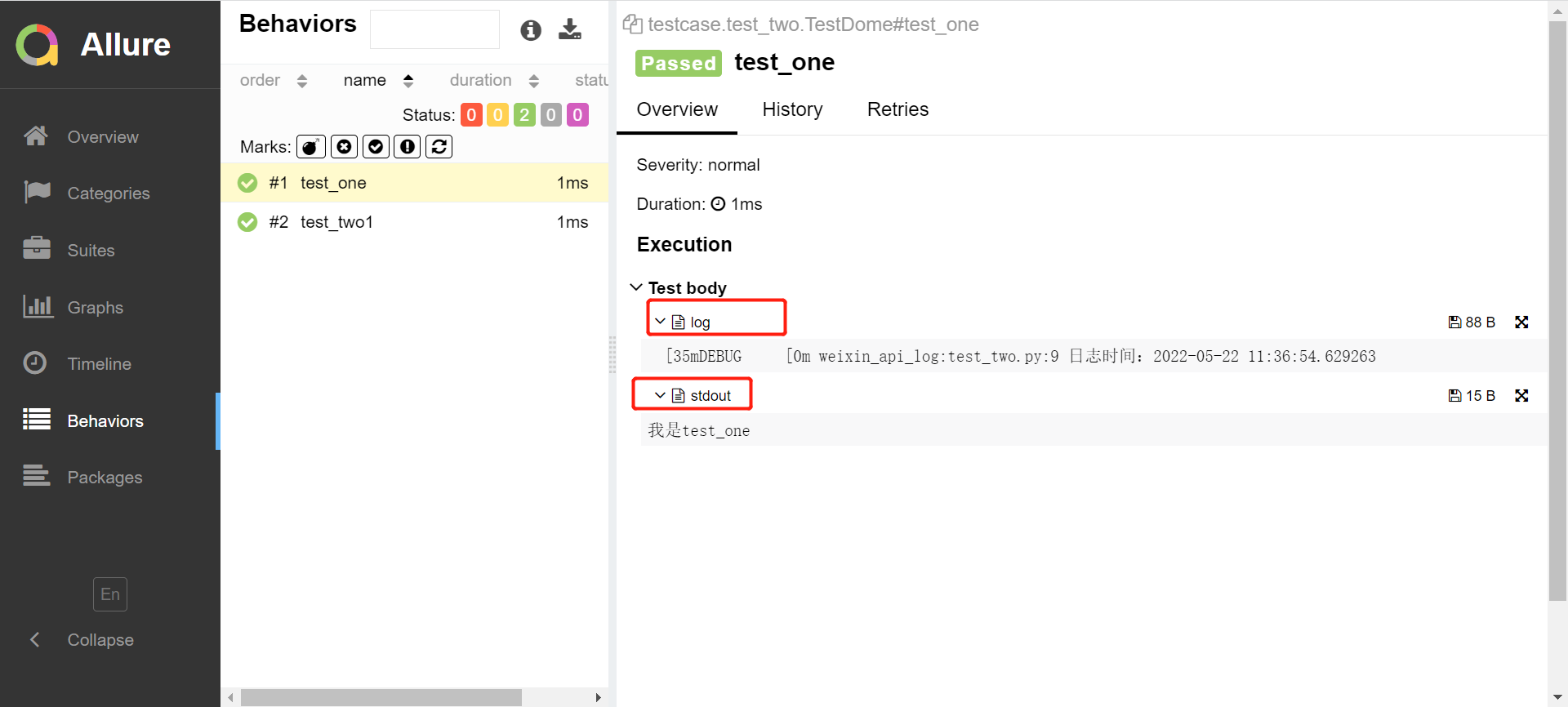 | 12345678910 | class TestDome:``@allure``.title(``"我是one"``)``def test_one(``self``):``print``(``"我是test_one"``)``assert True @allure``.title(``"我是two"``)``def test_two(``self``):``print``(``"我是test_two"``)``assert False |