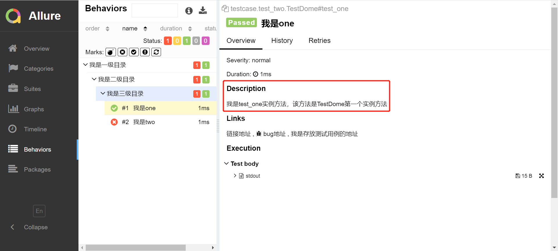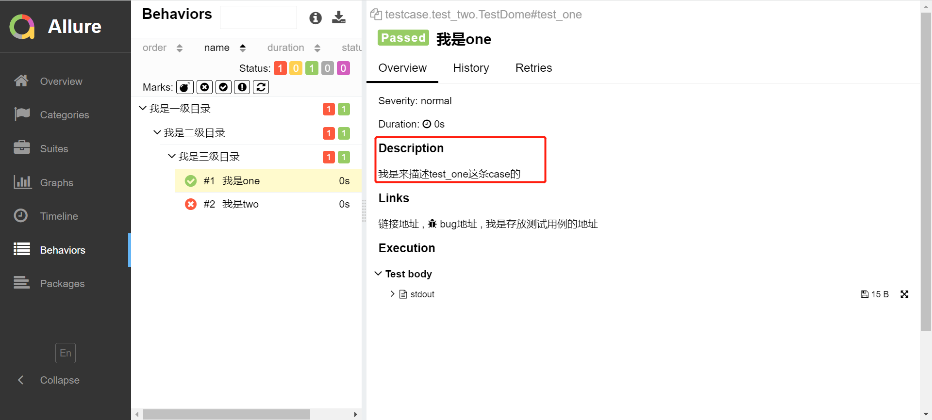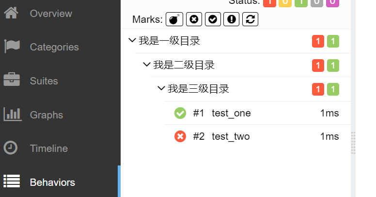 | 123456789101112 | import allure``@allure``.epic(``"我是一级目录"``)``@allure``.feature(``"我是二级目录"``)``@allure``.story(``"我是三级目录"``)``class TestDome:``def test_one(``self``):``print``(``"我是test_one"``)``assert True def test_two(``self``):``print``(``"我是test_two"``)``assert False |