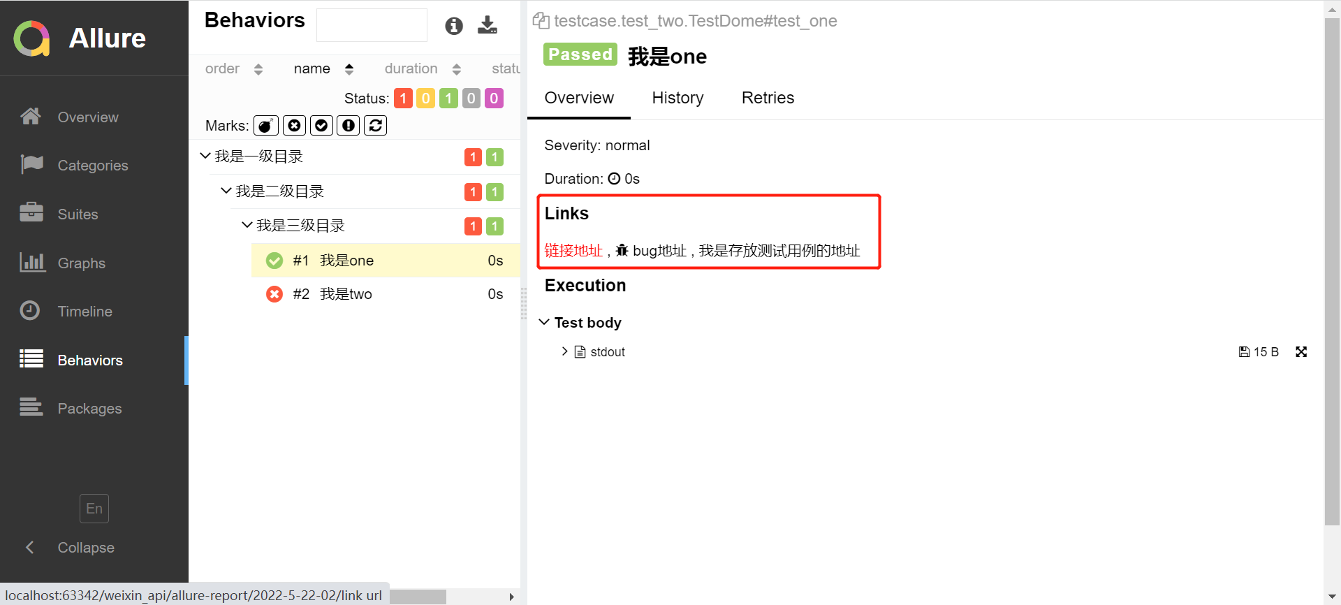| 123456789101112131415161718192021222324 | import pytest``import allure @allure``.epic(``"我是一级目录"``)``@allure``.feature(``"我是二级目录"``)``@allure``.story(``"我是三级目录"``)``@allure``.testcase(``"path url"``, name``=``"我是存放测试用例的地址"``)``@allure``.issue(``"bug url"``, name``=``"bug地址"``)``@allure``.link(``"link url"``, name``=``"链接地址"``)``class TestDome:``@allure``.title(``"我是one"``)``def test_one(``self``):``"""我是test_one实例方法,该方法是TestDome第一个实例方法"""``print``(``"我是test_one"``)``assert True @allure``.title(``"我是two"``)``def test_two(``self``):``print``(``"我是test_two"``)``assert False # pytest --alluredir=./report/2022-5-22-02 testcase/test_two.py``# allure generate -o ./allure-report/2022-5-22-02 ./report/2022-5-22-02 |
