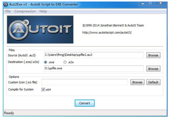 点击“Browse”选择upfile.au3 文件,点击“Convert”按钮将其生成为upfile.exe 程序。