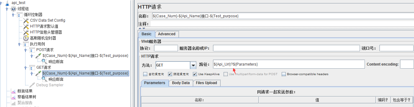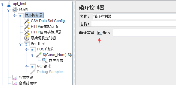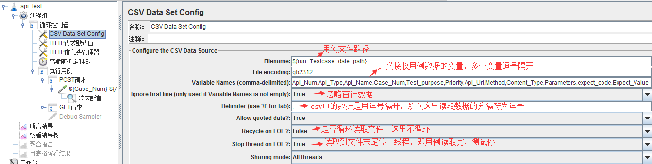 循环控制器下新增CSV Data Set ConFig控件,循环读取用例文件中的测试用例,如图