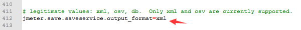 jmeter.save.saveservice.output_format=csv为jmeter.save.saveservice.output_format=xml,并去掉前面的注释符号#,如图所示
