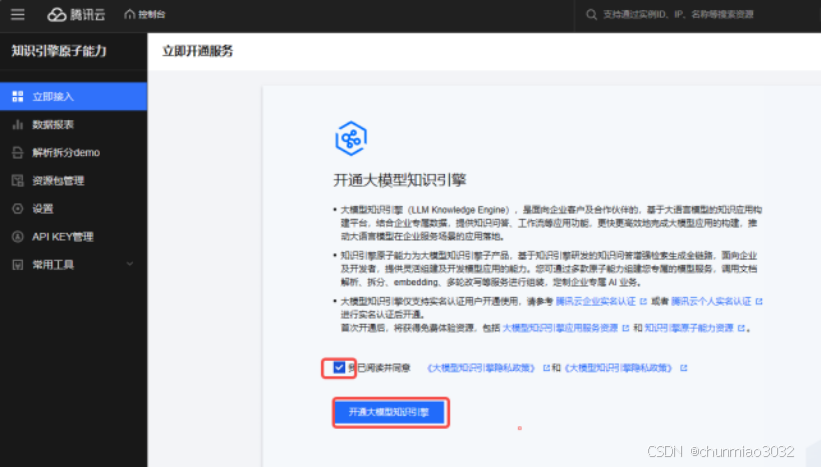 注册、登录后,勾选我已阅读并同意,点击开通大模型知识引擎