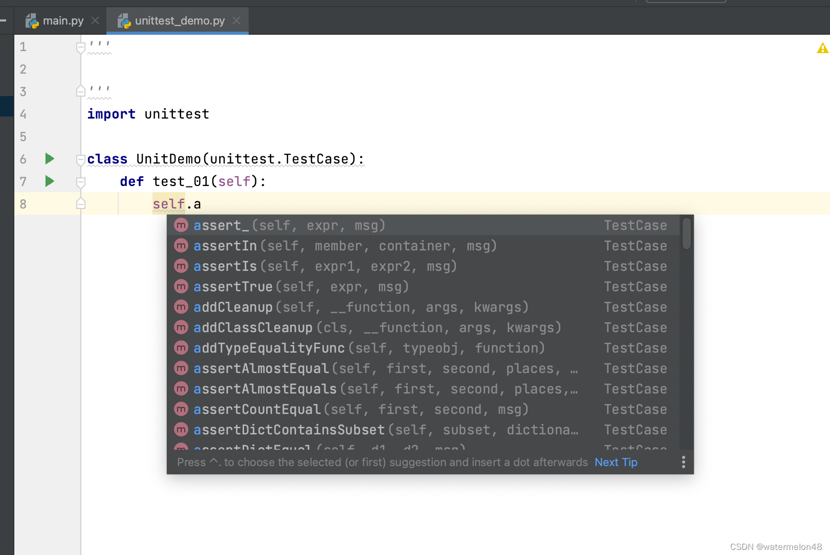 3. unittest的调用,一定是在main中调用unittest.main()的方式来实现。