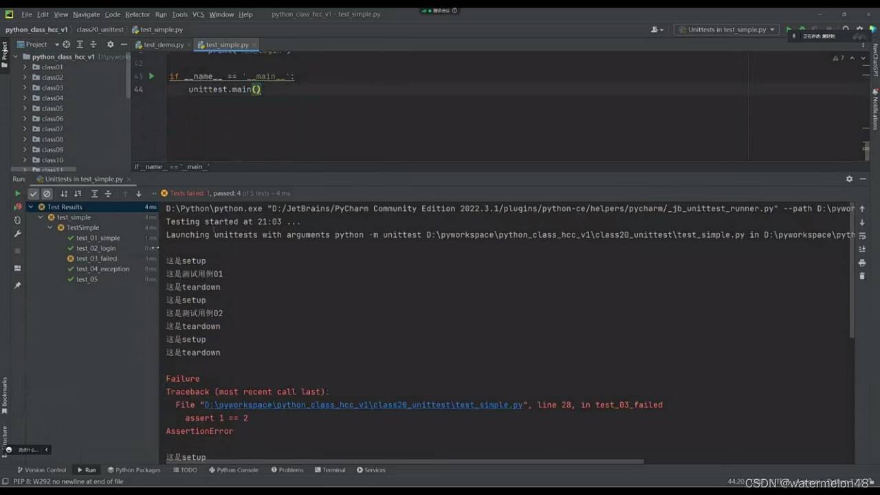 前置与后置条件:测试流程执行前必须要提前准备好的内容叫做前置条件。测试流程执行结束之后必须要执行的内容叫做后置条件。前置条件一般用于做初始化行为,后置条件一般用于做资源释放的相关操作。前后置条件不会关联到任何业务逻辑。setup与teardown是前置与后置。定义是通过函数来实现。分为函数级别和类级别的前后置。