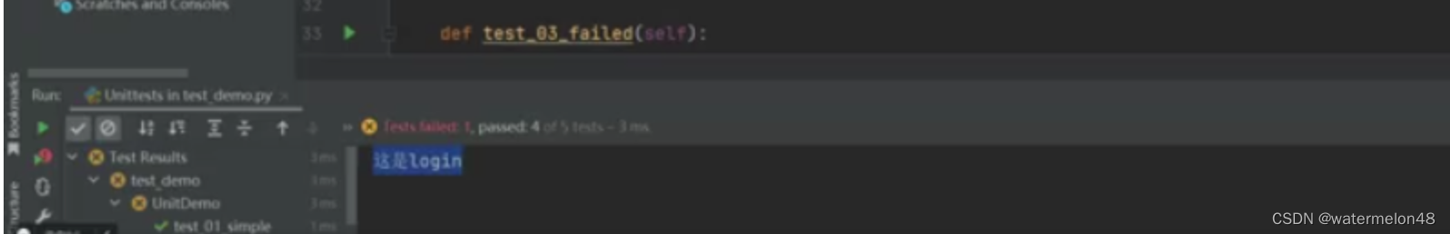 #创建一个套件对象 suite = unittest.TestSuite() #1.基于测试用例的名称来进行用例添加 #添加测试用例到一个套件中 suite.addTest(UnitDemo1('test_02_login'))这里是提前准备好的测试用例test_02_login suite.addTest(UnitDemo1('test_03_failed'))这里是提前准备好的测试用例test_03_failed #运行器的生成 run = unittest.TextTestRunner() #运行运行器 run.run(suite)