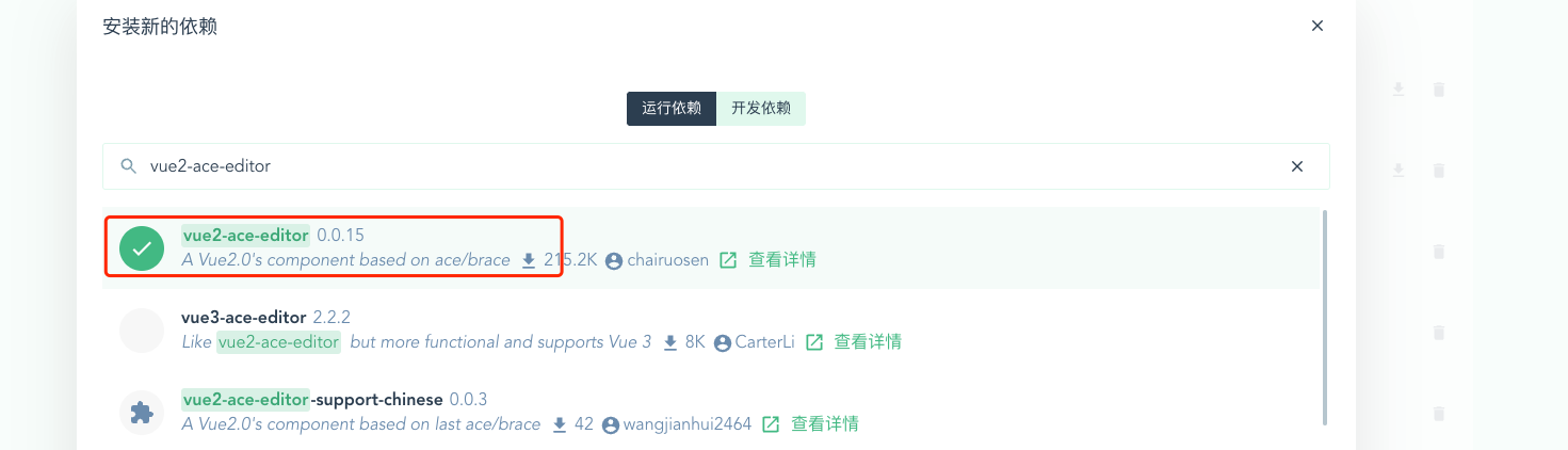 注意,我们使用的vue2, 所以这里是 vue2-ace-editor