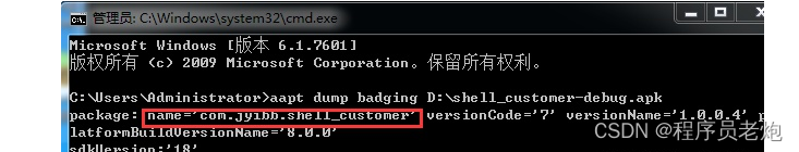 cmd打开命令行窗口,输入aapt dump badging D:\XXX.apk(xxx指安装包名,D:\是指路径)直接查看需要测试app安装包的具体信息。