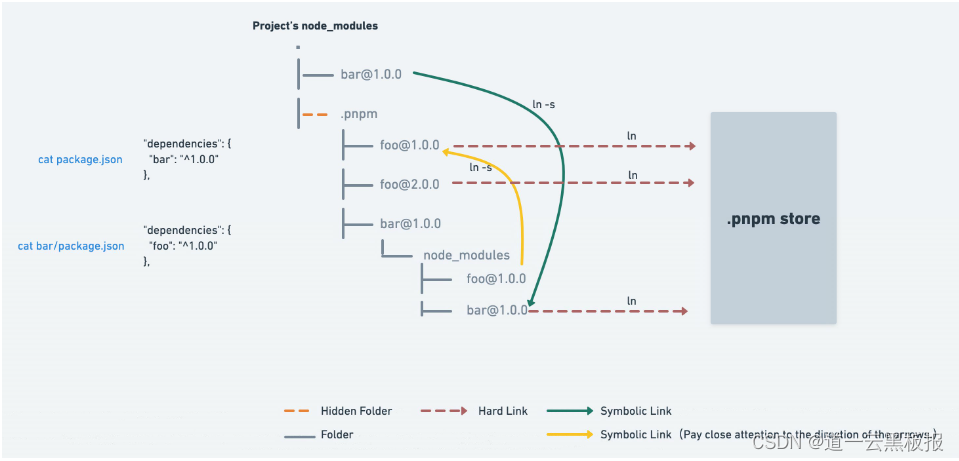 pnpm 使用的是铺平和链接的方式安装node_modules结构。执行pnpm install后会将依赖安装到一个全局store中,并通过硬链接的方式链接到虚拟store,即node_modules/.pnpm文件夹。如上图下载了bar@1.0.0依赖后,node_modules下会生成bar@1.0.0和.pnpm文件夹,不会像npm那样将bar@1.0.0下的相关依赖铺平在node_modules下,而是铺平在.pnpm下再硬链接到store,而node_modules下的bar@1.0.0只是一个符号链接,通过软链接到.pnpm/bar@1.0.0。此时项目中要是想引入foo@1.0.0,就会报错,也就解决了npm中幽灵依赖的问题。
