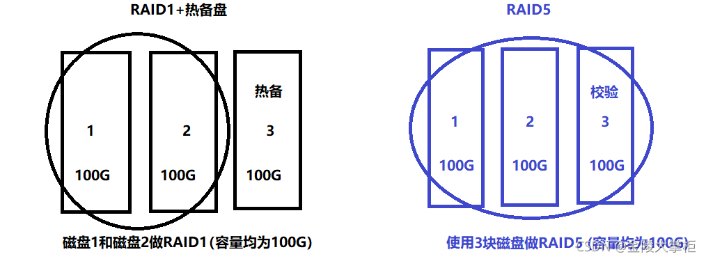 现在讨论RAID1+热备和RAID5的优缺点,以上图为例,对于前者来说正常情况下3号磁盘做热备不存数据,1号和2号磁盘存放的是相同的数据,所以对于数据而言,原本仅需占用1块磁盘的100G的数据实际上却用了3块容量为100G磁盘,浪费了两块磁盘的容量,但是容错数却是两块磁盘;对于后者而言,3块磁盘中的两块用于存放实际数据,浪费了一块磁盘的容量,但是容错数却是一块磁盘(即只能坏一块)。