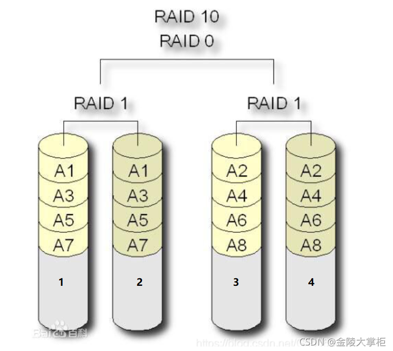 在上面的基础我们去考虑4块盘如何做RAID?这里还是不考虑RAID0和RAID3,如果4块磁盘的话我建议考虑RAID1+0或RAID5.正常情况下RAID1+0的磁盘实际使用率仅为1/2,这个不难理解吧,即原本仅需占用2块磁盘的200G的数据实际上却用了4块容量为100G磁盘,浪费两块磁盘的容量,利用率为50%,而且RAID 1+0在最坏的情况下仅能允许坏一块磁盘(以下图为例不能有两块盘同时坏在一组RAID1中,比如1号和2号磁盘同时故障);虽然4块磁盘组成的RAID5也是只能允许坏一块磁盘,但是磁盘的利用率高,4块磁盘使用了3块存放实际数据,利用率为75%。所以建议使用RAID5。