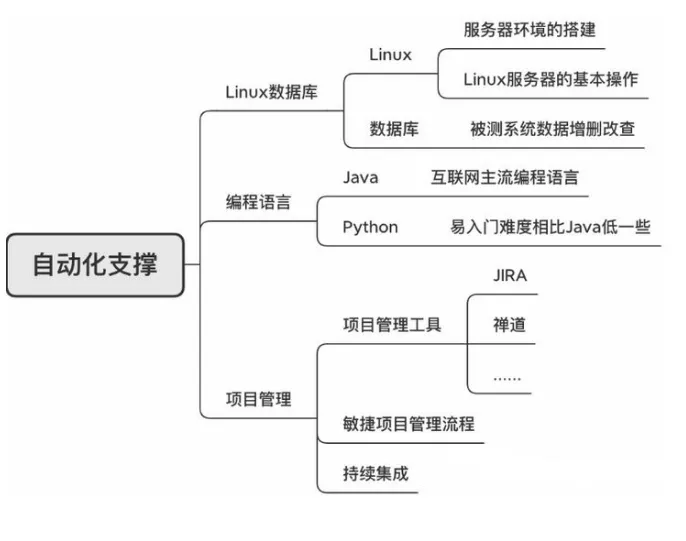看完自动化测试分类后,若想得到一个完整的自动化测试完整路径。我们还需要了解学习自动化测试的前置(支撑)知识和技能。