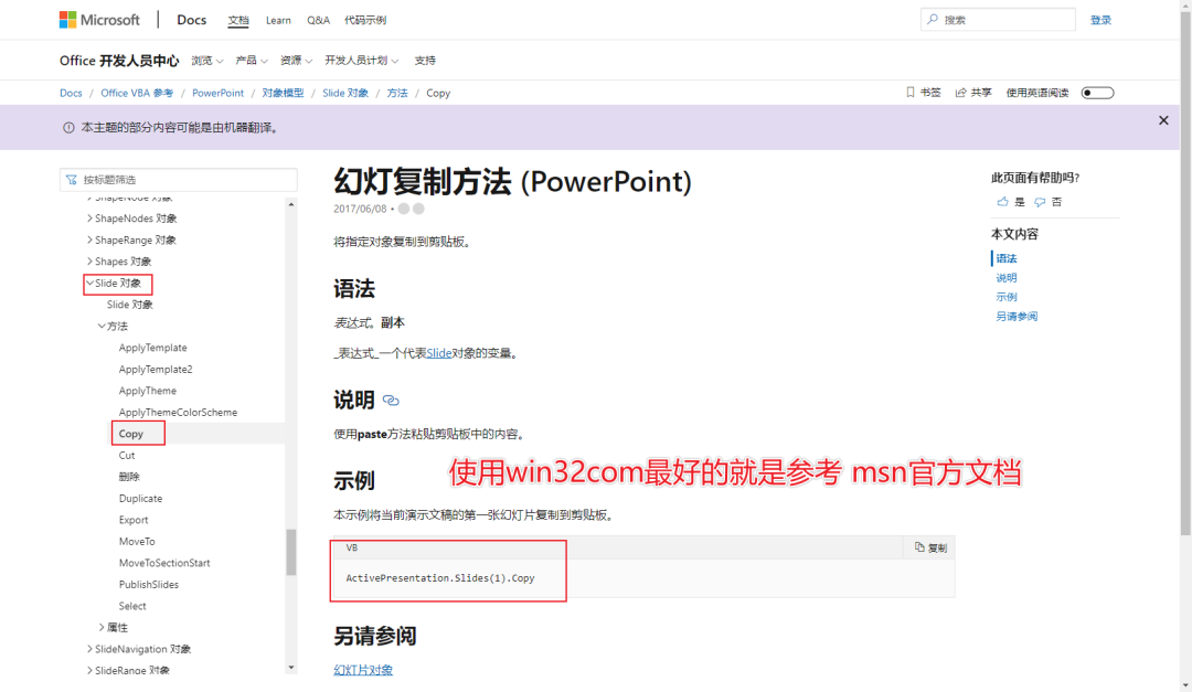 参考官方文档:https://docs.microsoft.com/zh-cn/office/vba/api/powerpoint.slide.copy
