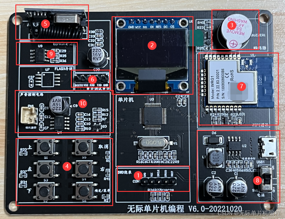 板子接上USB,然后打开⑧-电源及开关通电,上电以后,②-OLED屏会显示菜单,这样可以就能直接看到OLED屏有没有问题,同时这里还可以测试③-蜂鸣器,但需要程序配合,上电时让蜂鸣器嘀一声。