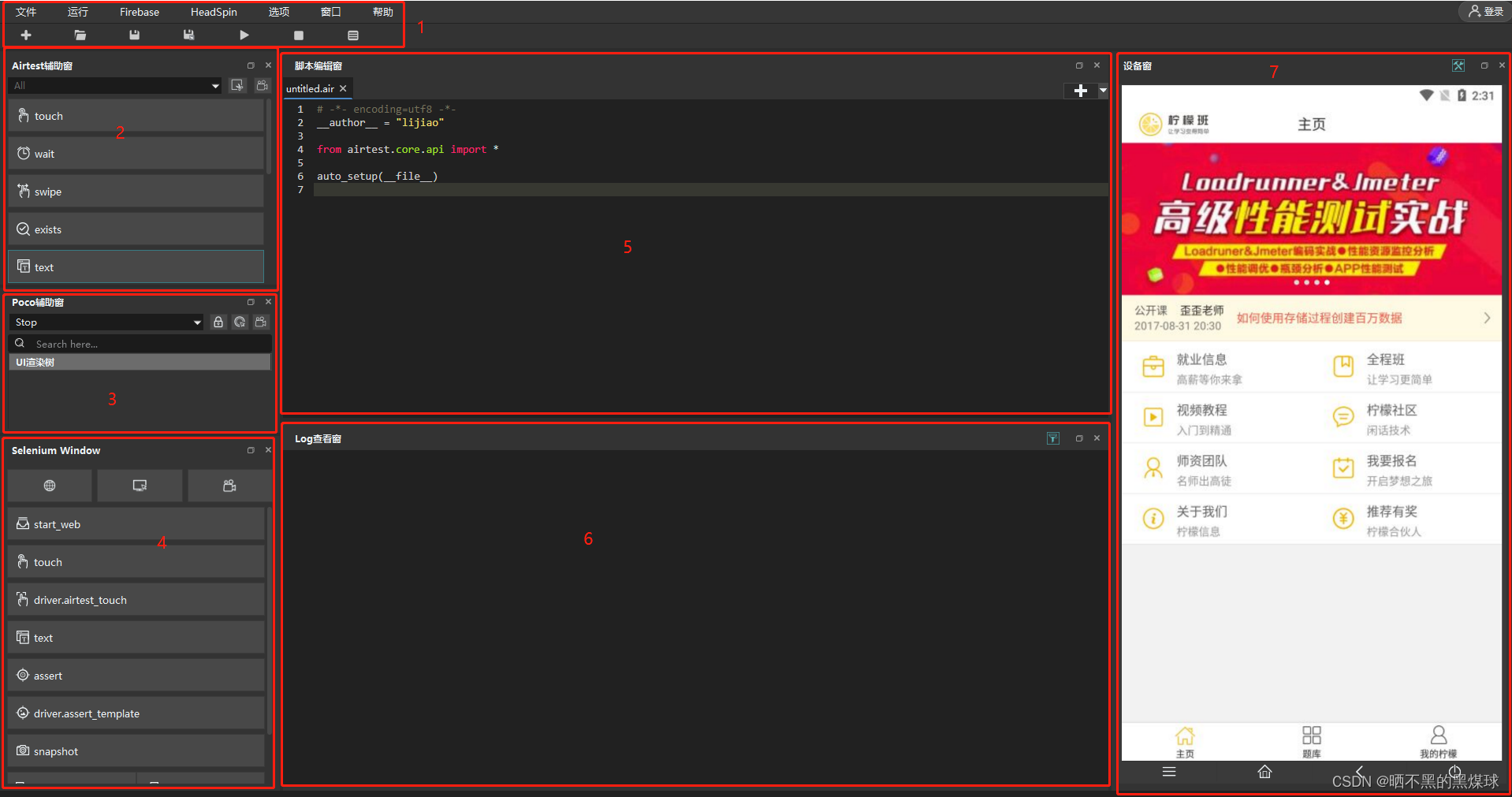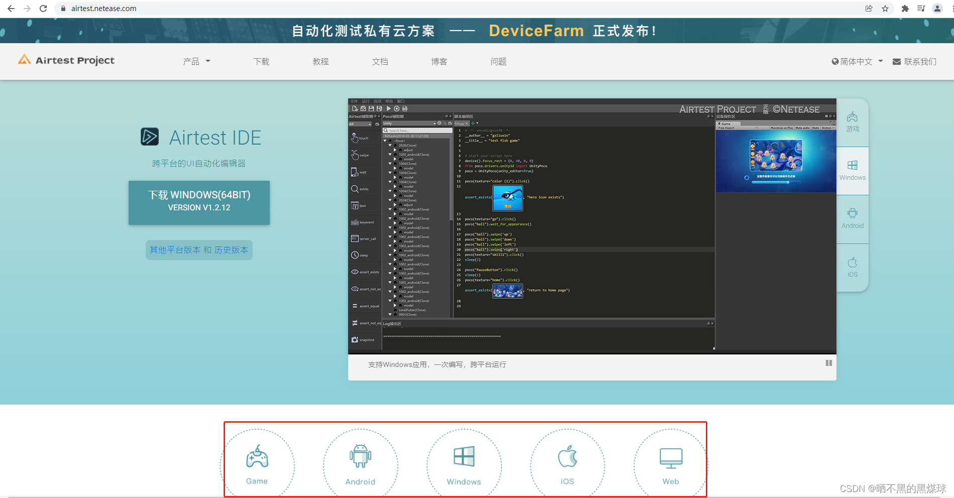 airtest是网易出品的一个基于python的跨平台的,基于图像识别的自动化测试框架,适用于游戏和APP,支持多平台,此款框架不需要一行行的写代码,而是用屏幕截屏的方式来进行自动化测试之前提到过使用weditor工具进行元素定位的话,是不可以跟appium同时打开的,所以使用airtest就解决了这个问题1.下载与安装直接进入官网https://airtest.netease.com/下载并安装