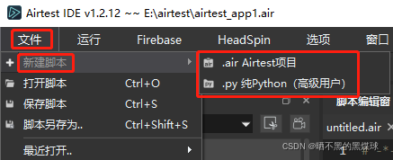 - 新建一个脚本,打开【文件】-->【新建脚本】-->两种方式(一种纯airtest代码,一种纯python代码)
