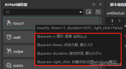 - 点击app操作,看下图:有四个参数,除了第一项,其他都有默认值,可以不用设置,首先点击touch按钮,然后把鼠标移动到要点击的app上,选中松手,就可以看到点击app图标的代码