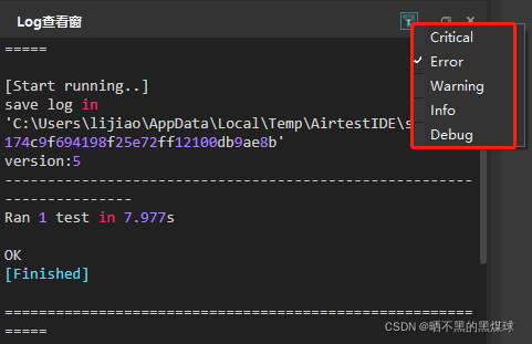 - 运行脚本:三种方式:第一种点击【运行】-->【运行脚本】(按快捷键一样),第二种:点击快捷键,第三种:选择要运行的代码,右击【只运行选中代码】,运行代码后可以看到有对应的日志信息,可以选择查看日志级别