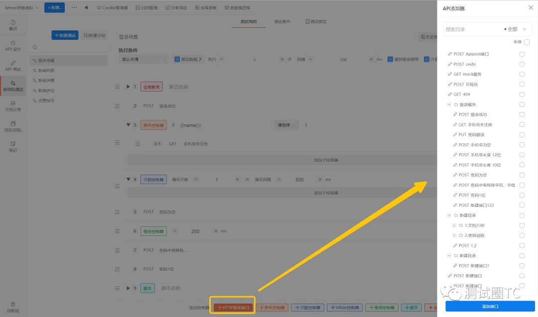 在Apipost6及以前的版本里,用户可以在测试模块一键添加APIS内的接口,该交互方式非常直观快捷,广受用户好评,所以我们在7版本继续沿用了这种添加方式:点击“API添加器”,右侧会弹出与APIS模块同步的目录,我们可以从里面选择接口复制至当前的流程配置中。
