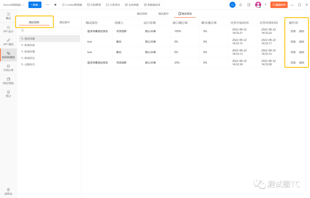 测试报告板块用于查看已被保存的测试用例报告和测试套件报告,我们可以对指定报告进行多选、查看、删除、并支持导出HTML格式等操作。