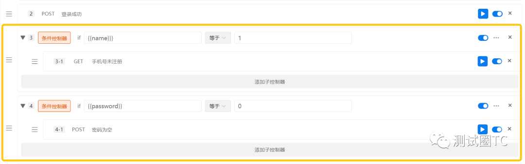 1.条件控制器:判断一个变量是否满足某个条件,由此决定该控制器下接口是否运行。