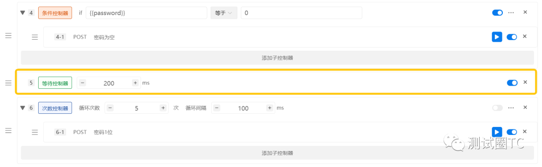 添加好待测接口后,我们可以继续配置各个节点所需要的控制器。Apipost提供以下六种控制方式,覆盖90%的测试场景,让测试人员在不写代码的前提下,依然可以完成自动化测试。