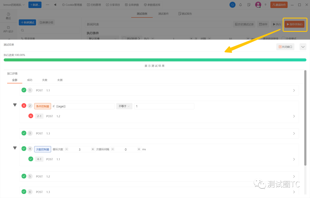 在配置好测试流程后,点击“保存并执行”,我们就可以看到运行的进度条和已经测完的接口信息了,运行过程中也可以切换页面,并支持多个测试计划同时运行。