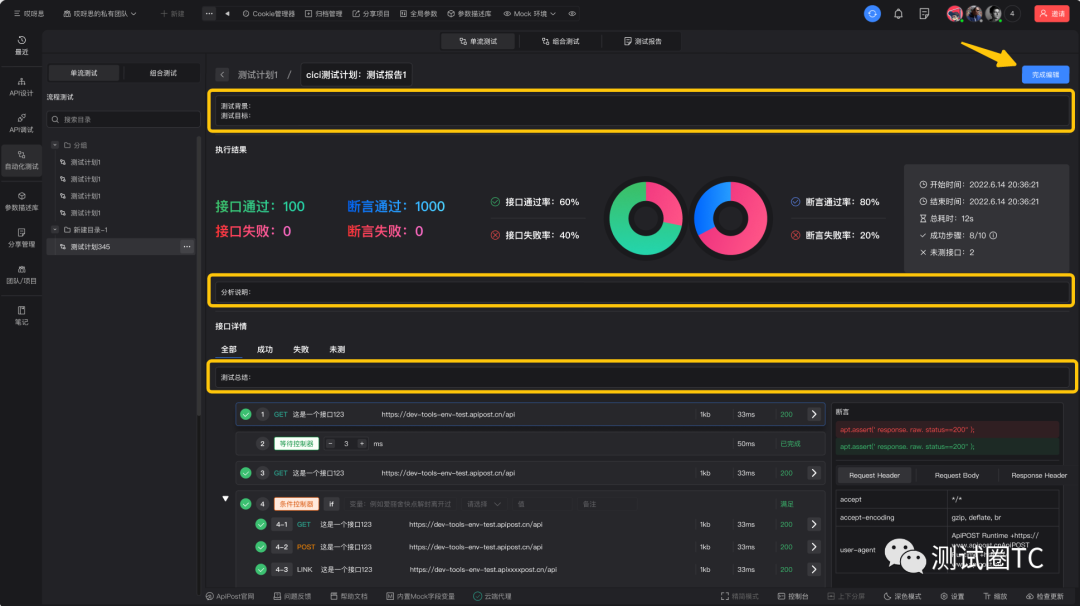 在测试套件的测试报告中,甚至可以从“测试计划”的通过情况开始,一路追查到该计划下的某个接口的某个断言的测试结果,可以说是非常详尽了,追踪BUG一查到底。