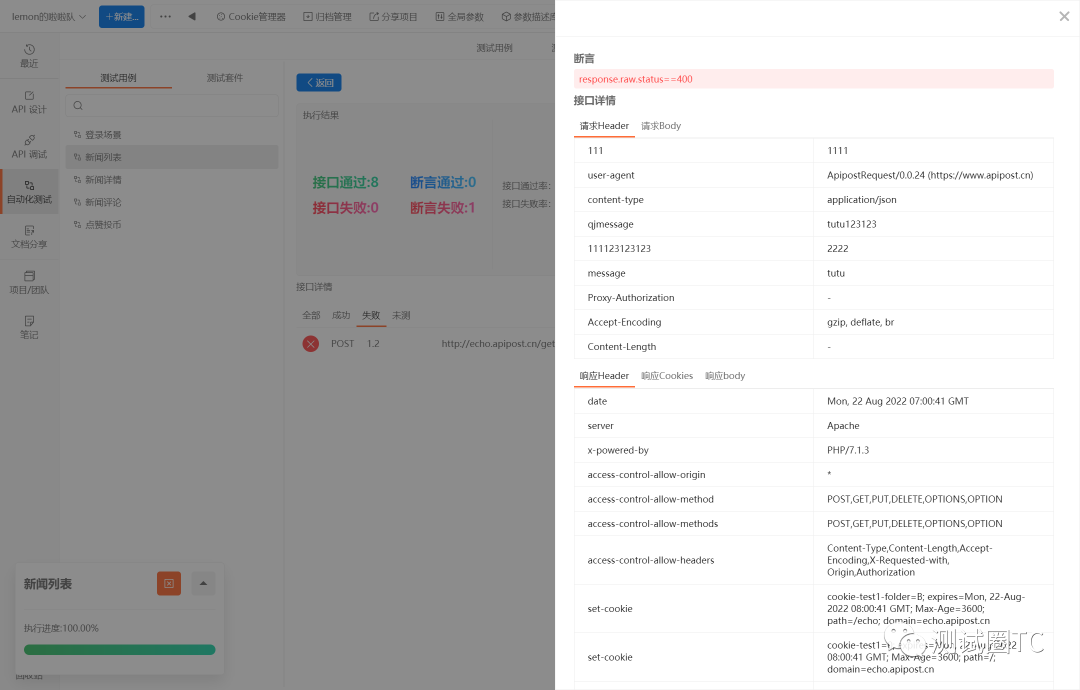 在测试报告详情页里,我们可以看到该报告的执行结果和接口信息,点击指定接口,还可以看到该接口下的断言内容和接口详情。