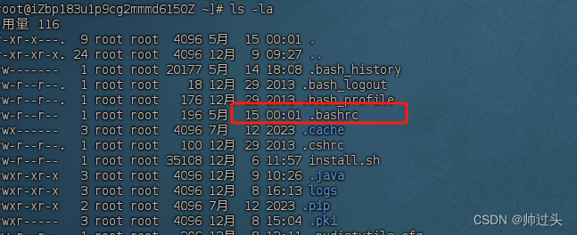 2,怎样解决上面的问题了,我们cd root/目录下,执行ls -la,-la是查看隐藏的文件。找到.bashrc文件