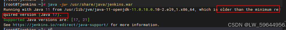 2、使用命令手动启动jenkins,报错可以看出,我当前环境安装的java11版本太老,当前安装的jenkins需要java17及以上的版本