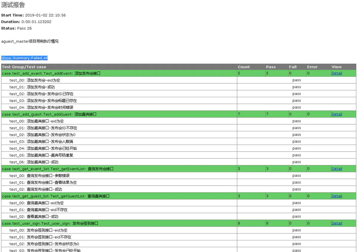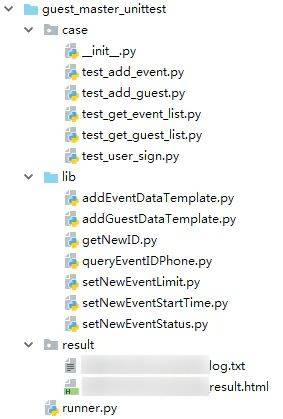 1) 由于总共只有5个接口,所以设计为5个代码文件,分别为:test_add_event,py,test_add_guest.py,test_get_event_list.py,test_get_guest_list.py,test_user_sign.py。