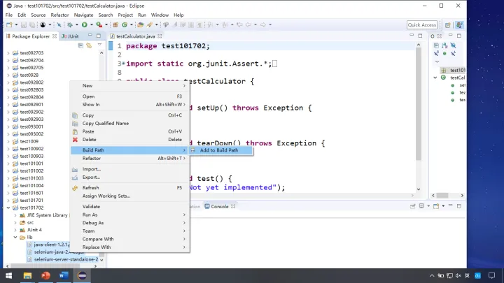 2、创建一个Junit的Java文件,将Junit4的相关包添加到build path中。