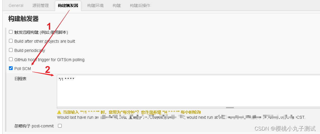 4)构建触发器 ---> Poll SCM 日程表(配置一分钟触发一次):*/1 * * * * 每分钟轮询