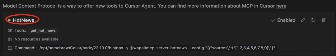 npx -y @wopal/mcp-server-hotnews --config "{\"sources\":\"[1,2,3,4,5]\"}"