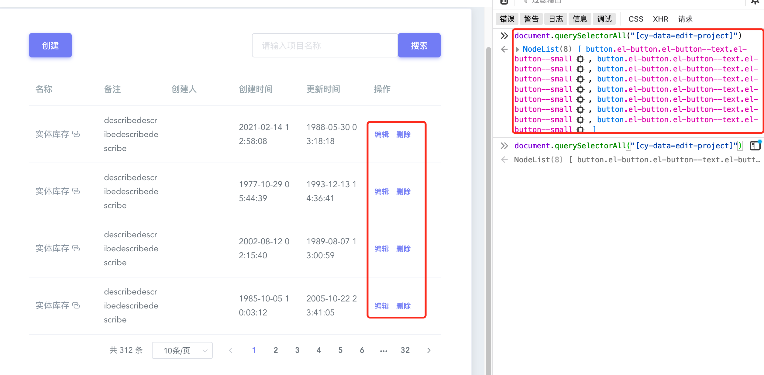 对于上面的列表,通过自定义定位得到的是一组元素。然而,如果只是一组元素的问题就就没必要单独拿出来说了,正如上图,列表中看到的是 4 个元素,通过定位方式得到的是8个元素,前4个是隐藏的,这和使用的 element-UI 库有关,因为数据是YAPI随机生成的,不能写死对第5个显示元素进行操作。 cypress 提供的 force 非常有用,他会强制对隐藏的元素进行操作。