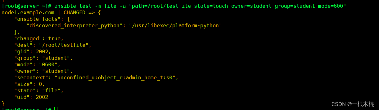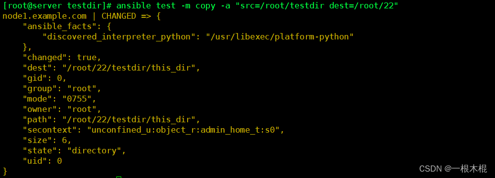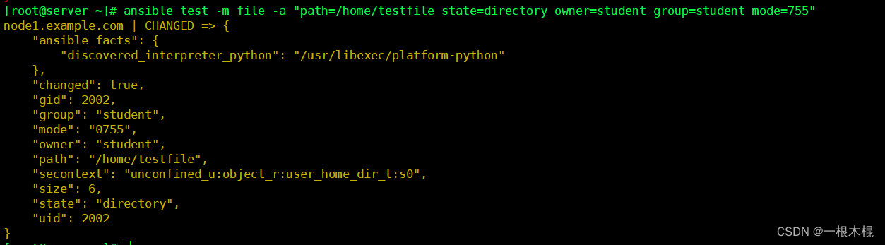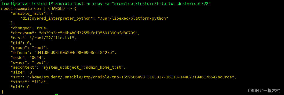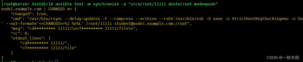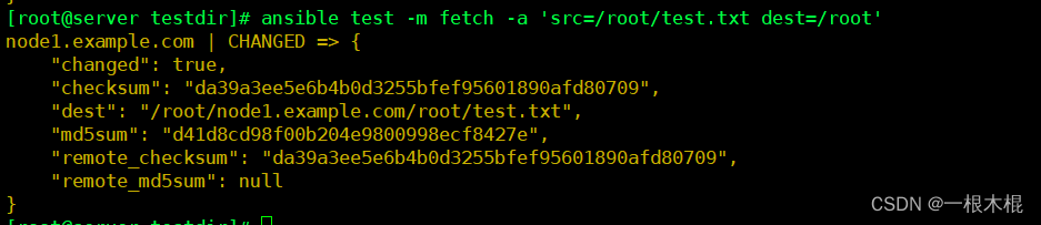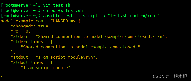 不同点:command可以在受管主机上执行shell命令,但是不支持环境变量和操作符(例如 '|', '', '&')不需要受管主机上安装Python,直接使用远程shell运行命令,通常用于无法安装Python的系统(例如网络设备等)。我们需要在控制机和受控制机上都必须有test.sh在这个文件。shell模块调用的/bin/sh指令执行。相同点:要求受管主机上安装Python。从被控制主机上取