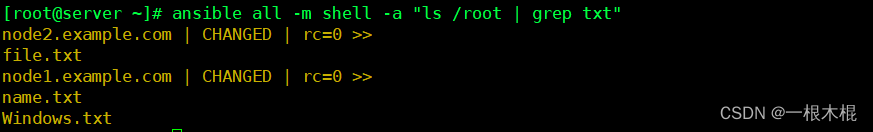 - shell模块执行命令 ls /root | grep txt