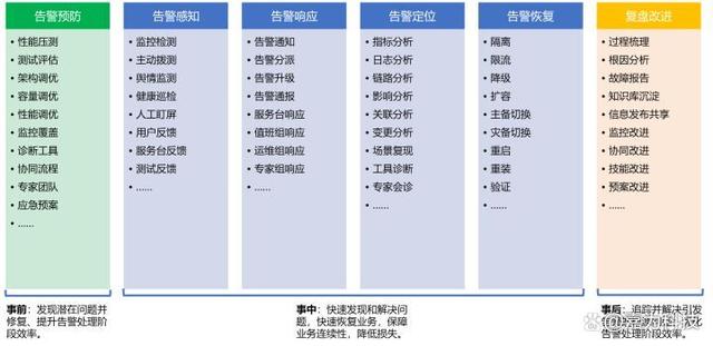告警恢复:通过一系列行之有效的方案快速恢复应用系统的功能,可以通过问题节点隔离、负载限流、服务降级、资源扩容、应用重启、切换灾备、问题系统重装上线等方式,快速恢复核心业务服务,尽可能减少损失。